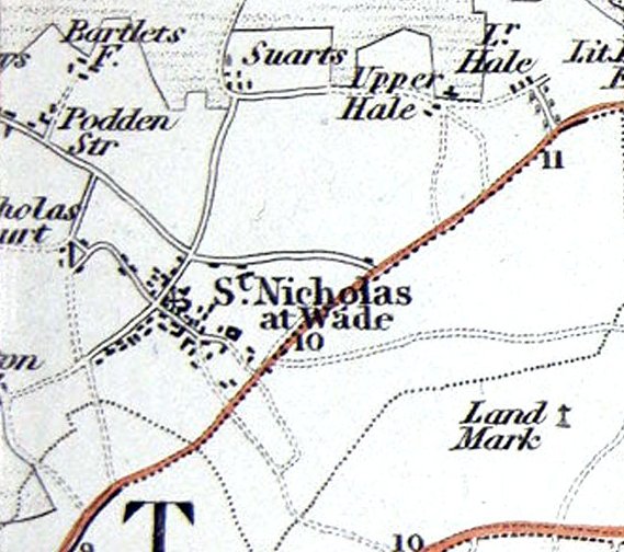 Thanet, St. PeterSt. Nicholas at Wade, a village and a parish in Thanet district, Kent. The village stands on comparatively high ground, overlooking the marshes of the Stour, 3 miles northeast of Grove Ferry rail station, and 6-1/2 miles west-south-west of Margate; and has a post office under Margate. The parish extends to the coast; measures about 4 miles from east to west, and 2-1/2 miles from north to south; and comprises 3,440 acres of land, and 220 of water. Real property in 1860, £8,222. Population in 1861, 590. Houses, 129. The property is divided among a few. The living is a vicarage in the diocese of Canterbury. Value £176 with a habitable glebe house. Patron, Archbishop of Canterbury. The church was originally a chapel of ease to Reculver; was transferred to the monks of Christchurch, Canterbury, and was rebuilt by them; is partly Norman, partly early English, partly decorated English, with interesting features; comprises nave, aisles, and chancel, with a porch and a lofty tower; and was restored in 1863. The civil parish of the same name at the 1921 census was coextensive with the ecclesiastical parish.3 ChurchesThere is also a Wesleyan chapel.1 SchoolsThere is a national school.1 CharitiesCharities to the value of £94.1 1John Marius Wilson, comp. The Imperial Gazatteer of England and Wales. (London, England: A. Fullerton & Co., 1870). 2Edward Hasted, ed. and comp. The town and parish of St. Nicholas at Wade: Town and manors, The History and Topographical Survey of the County of Kent: Volume 4 (1798), pp. 260-307. 3William Page, 1861-1934, ed. The Victoria County History of Kent, vol. 3, p. 360.(London, England: The St. Catherine Press, Stamford Street, Waterloo, S.E., 1932). Thanet, St. Peter's Bibliography-- various. 'Archaeologia Cantiana'. Publisher: Kent, England: Kent Archaeological Society, various dates. [Note: The following volumes can be found on archive.org: 1, 2, 3, 4, 5, 6, 7, 8, 9, 10 (1876), 11, 12, 13 (1880), 14, 15, 16, 17, 18, 19, 20, 21, 22, 23, 24, 25, 26, 27, 32, 34, 35, vol. 1907 supplement.]